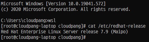 CMD 참에서 wsl 또는 bash 입력하고 엔터하면 Red Hat Enterprise Linux Server로 전환이 됩니다.